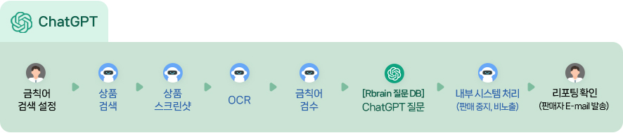 OCR로 추출한 상품 판매 페이지의 텍스트를 ChatGPT를 활용하여 문장의 의미를 분석하고, 금칙어 여부를 판단하는 프로세스를 도입할 수 있습니다.