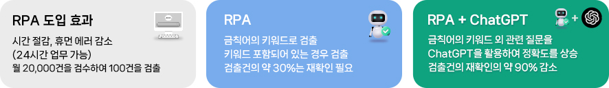 최근 IT 시장에서는 ChatGPT를 적극적으로 도입하고 있으며, 이를 활용한 다양한 새로운 서비스가 출시되고 있습니다. 오늘은 RPA와 ChatGPT 기술을 이용해 구현할 수 있는 <이커머스 상품 금칙어 검수> 자동화 사례를 소개하겠습니다.